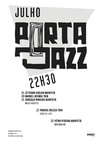 O mês de Julho traz novo ciclo da Associação Porta-Jazz a vários locais do Porto, com formações de estilos diversificados e diferentes gerações, num total de cinco concertos que decorrem a cada fim-de-semana do mês.