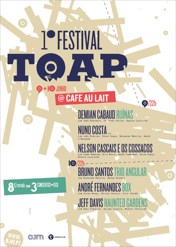 São boas notícias, as que chegam da editora Tone of a Pitch: depois de Lisboa, no passado mês de Abril, o 1º Festival TOAP- que celebra os quase 10 anos de existência e persistência da editora criada pelo guitarrista e compositor André Fernandes- marca presença no Porto. À semelhança do que aconteceu em Lisboa, na LX Factory, o Porto recebe 3 formações por noite... e alguns dos músicos que mais podemos ouvir nos discos lançados pela TOAP.