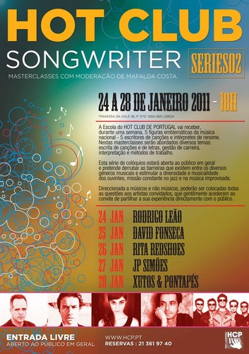 No ano passado, por esta altura, a Escola do Hot Clube recebeu Fernando Ribeiro e Pedro Paixão (Moonspell), Tiago Bettencourt, Camané, Manuela Azevedo e Hélder Gonçalves (Clã), Sérgio Godinho, Sam the Kid e Manuel João Vieira. Este ano, na sua 2ª edição, a Songwriter Series do Hot Clube convida Rodrigo Leão, David Fonseca, Rita Redshoes, JP Simões e Xutos & Pontapés para partilharem com músicos, alunos e interessados, as suas experiências e histórias enquanto músicos. As masterclasses decorrem entre 24 e 28 de Janeiro, a partir das 18h, e a entrada é livre mas o número de lugares limitado, pelo que se aconselha a reserva através do 21. 361. 97. 40. Escola de Jazz Luiz Villas-Boas/ Hot Clube de Portugal, Travessa da Galé, 36, 1º dto, à Junqueira, Lisboa.
