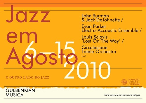 O Jazz em Agosto 2010 começa na 6ªf, com o encontro em palco, raro, do baterista Jack DeJohnette e do saxofonista e clarinetista John Surman. De Charles Lloyd a Keith Jarrett, passando por Coltrane, Rollins, Miles, Ornette Coleman, Chet Baker, e Hancock, entre muitos outros, DeJohnette tem marcado a história do jazz com o seu drumming, de influências muito diversificadas. Grande parte da sua discografia como líder encontra-se na editora ECM. Com John Surman mantém um dueto de música improvisada há quase 30 anos. Surman, compositor, saxofonista e clarinetista britânico, é um dos músicos que mais tem contribuído para o jazz e música improvisada no continente europeu. Na sua discografia encontram-se gravações com John Taylor, Barre Philips, Karin Krog, Paul Bley, Paul Motion, Bill Frisell e Dave Holland.