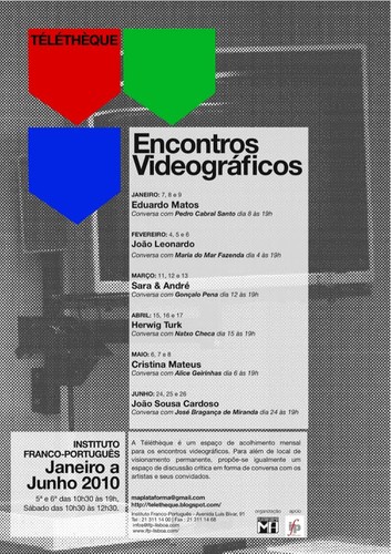 Os Encontros Videográficos (Téléthèque) mensais que o IFP acolhe desde Janeiro centram-se, este mês, no trabalho de Cristina Mateus, com a exposição e discussão da sua obra, numa proposta da Plataforma Ma comissariada por Aida Castro, Catarina Marto e Maria Mire. 5ªf, 6 de Maio, às 19h, Cristina Mateus e Alice Geirinhas conversam no IFP.